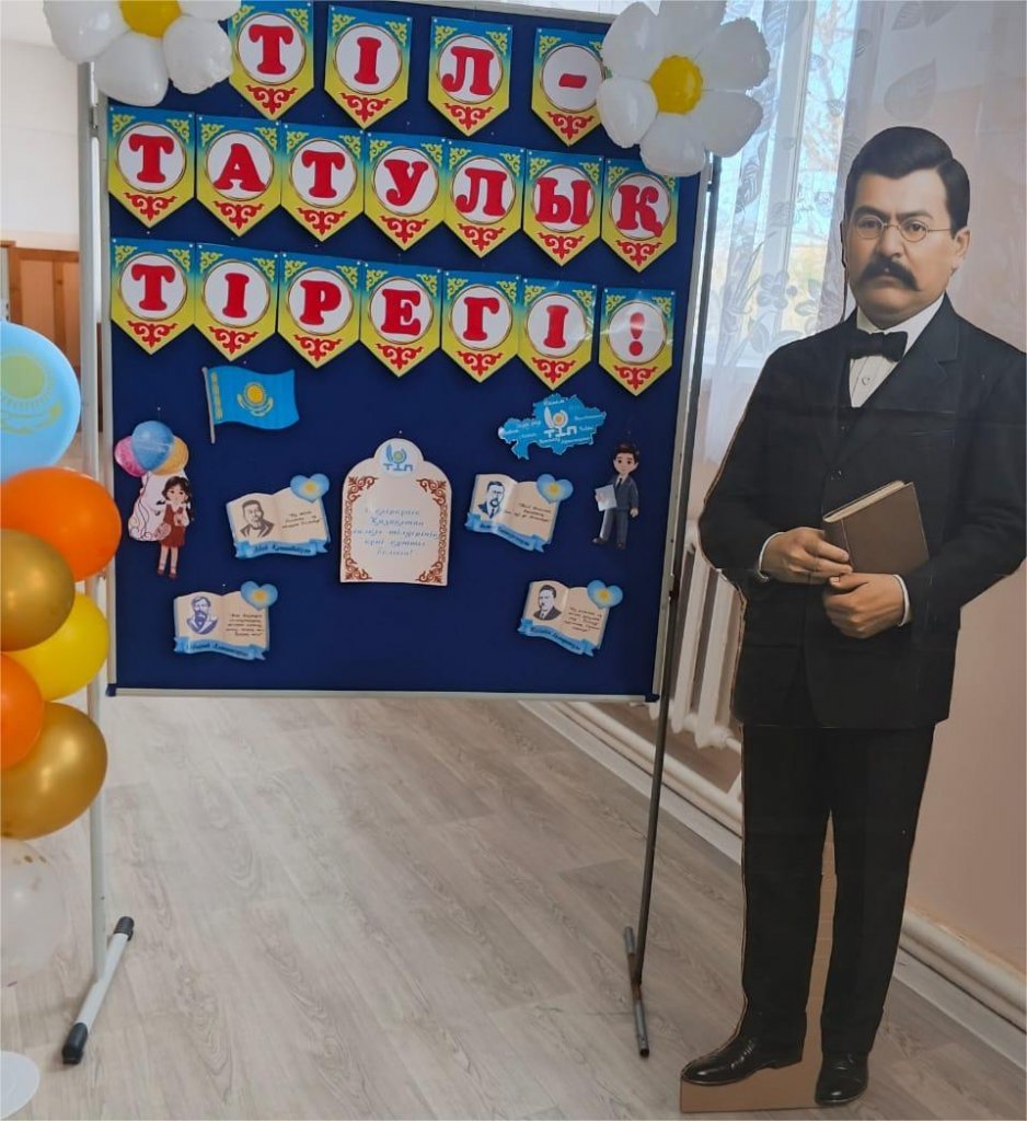 Ко Дню языков оформление в фойе. Әрбір тілде сәйле әлемді таң қылып, Ана тілін білмей өскен әңгүдік.Өсер болсаң байтак далаң тұрғанда ,Қазақ тілі жасау керек мәңгілік.